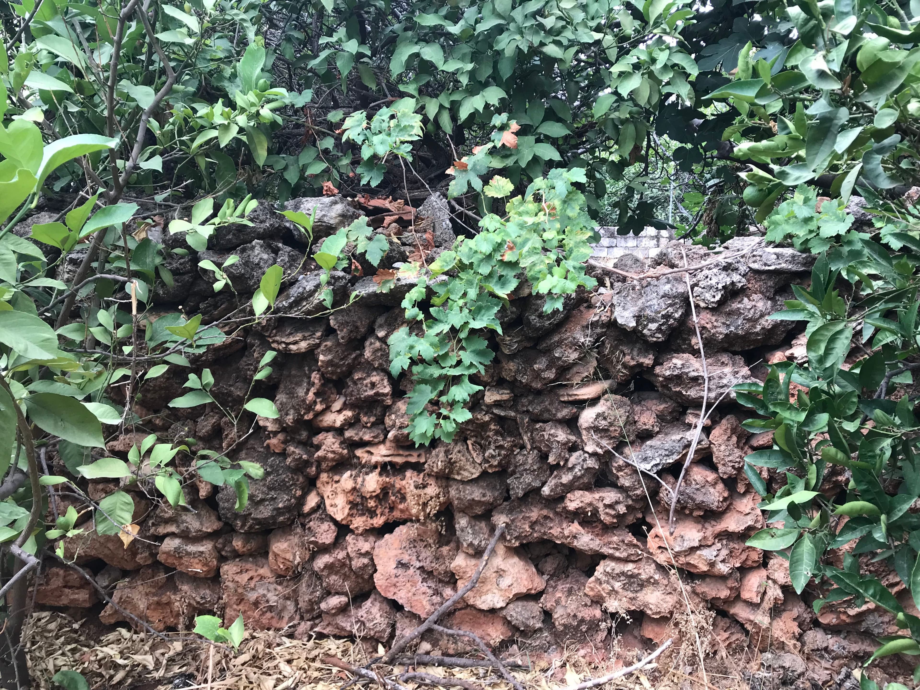 I love the natural texture of this wall that gently divides the gardens of the two houses.